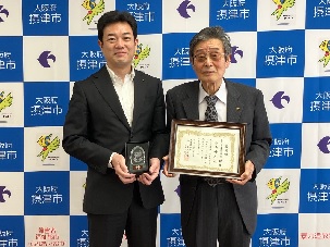 左:中張隆夫さん 右:嶋野浩一朗・摂津市長と中張さん「広報せっつ・七月号」(令和七年七月一日発行)
